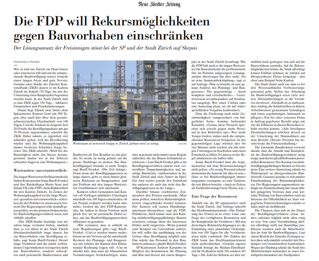 Die FDP will Rekursmöglichkeiten gegen Bauvorhaben einschränken